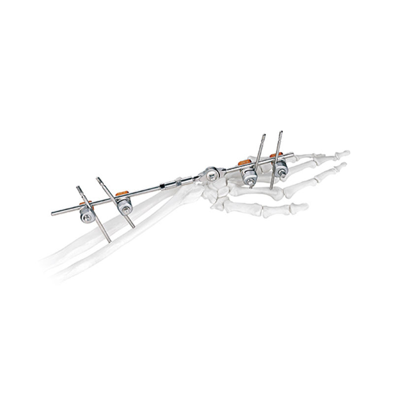 Un fijador externo de la articulación de la muñeca es un dispositivo que se utiliza para estabilizar la articulación de la muñeca durante el proceso de curación después de una lesión o cirugía.Se usa comúnmente en casos de fracturas complejas, dislocaciones o lesiones de ligamentos de la articulación de la muñeca.El fijador externo se coloca fuera de la piel y se sujeta a los huesos mediante alfileres o alambres, que se insertan a través de la piel hasta el hueso.