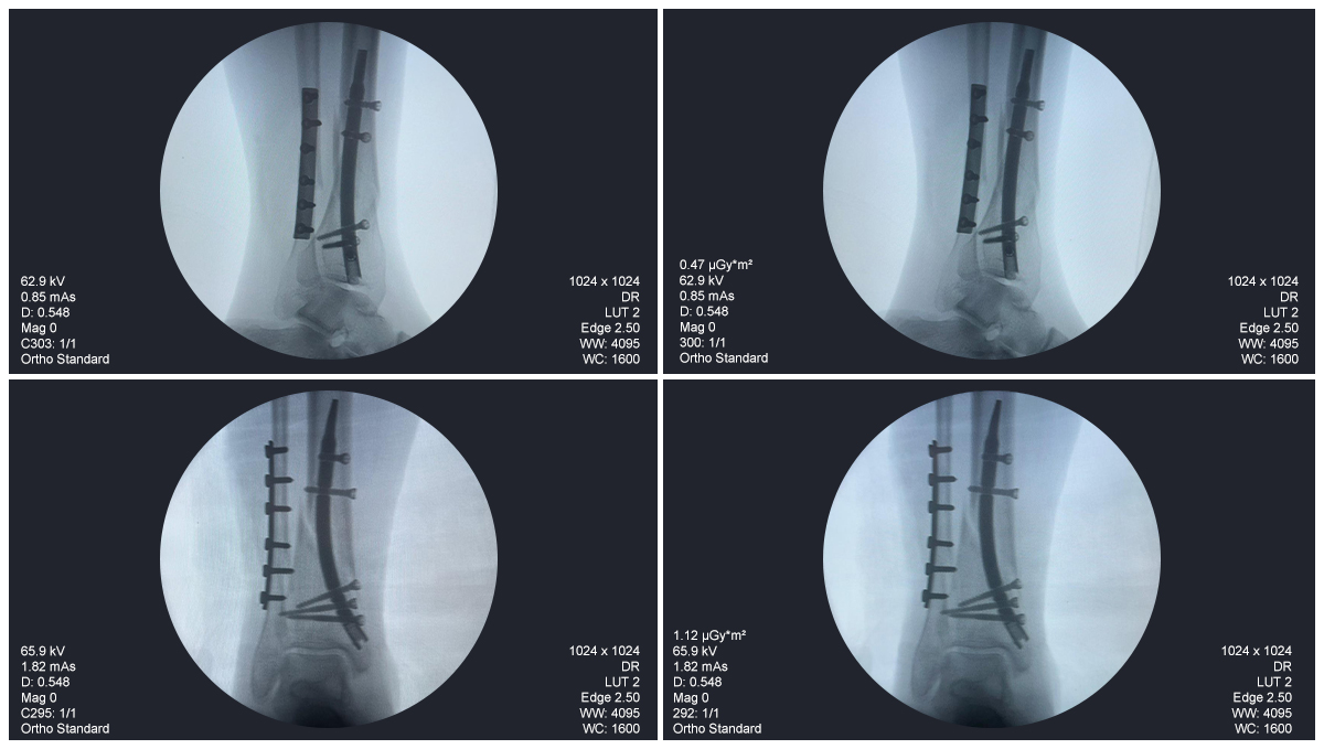 Este caso involucró la fijación de la tibia distal utilizando un clavo tibial distal intramedular. La fluoroscopia intraoperatoria confirmó la posición del clavo, los tornillos de bloqueo distales y la fijación de la placa del peroné.